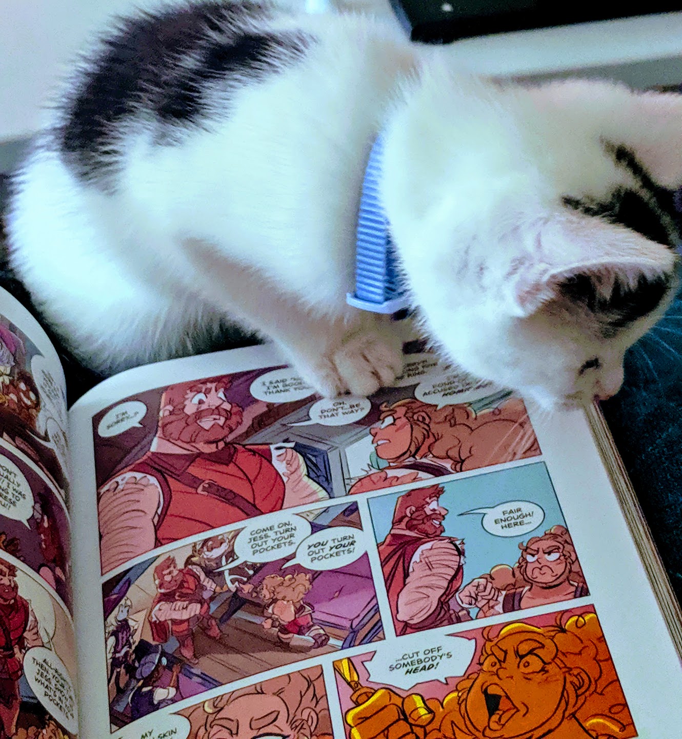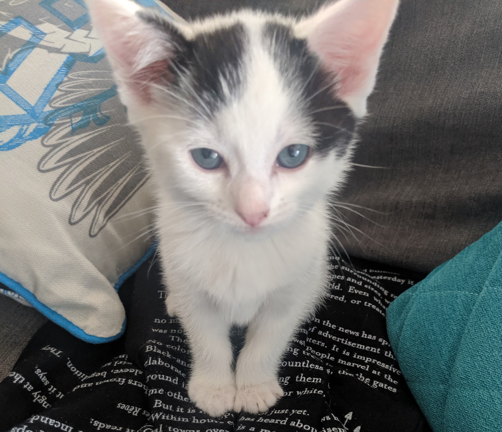 The White with black splodges in Mogget. For frequent visitors to my blog you will know that I adored Garth Nix’s Abhorsen trilogy and that by far Mogget was my favourite sassy talking cat. So when this tiny little white cat approached my husband for tickles in the kitten room we knew it was kismet and that he had to come home with us and had to be called Mogget. He is such a snuggler and just as chatty as his namesake.