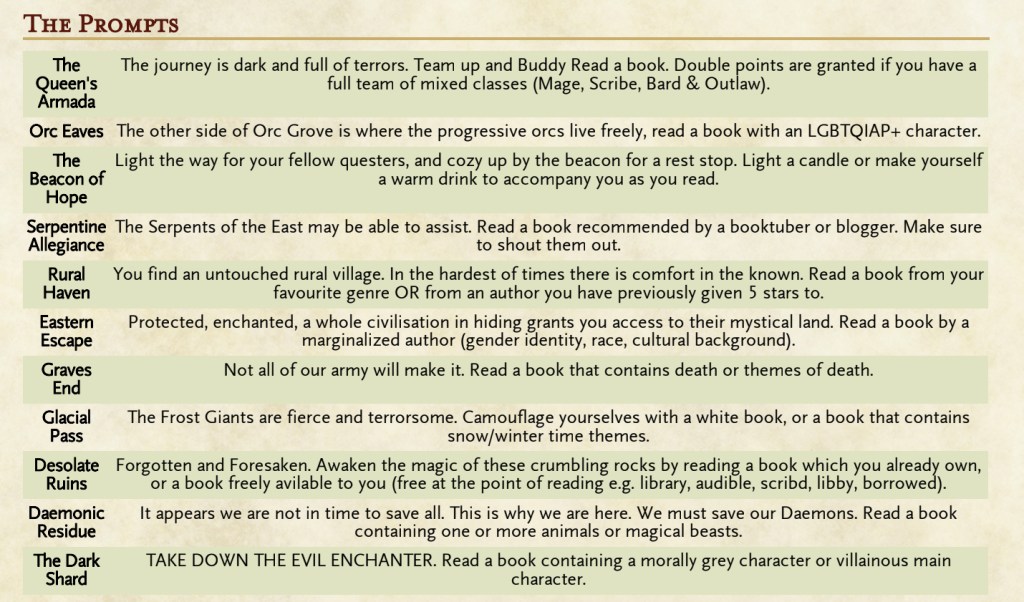 After the Bookie Trials – hunt for the bookie grail in the summer our beautiful deamons were taken captive by The Evil Enchanter. It is our job to band together and traverse the map as quickly as possible this means finding and reading as few books as possible to fit the prompts! (Hence the anti- readathon as it is focusing on reading and enjoying a small amount of books instead of a large amount).