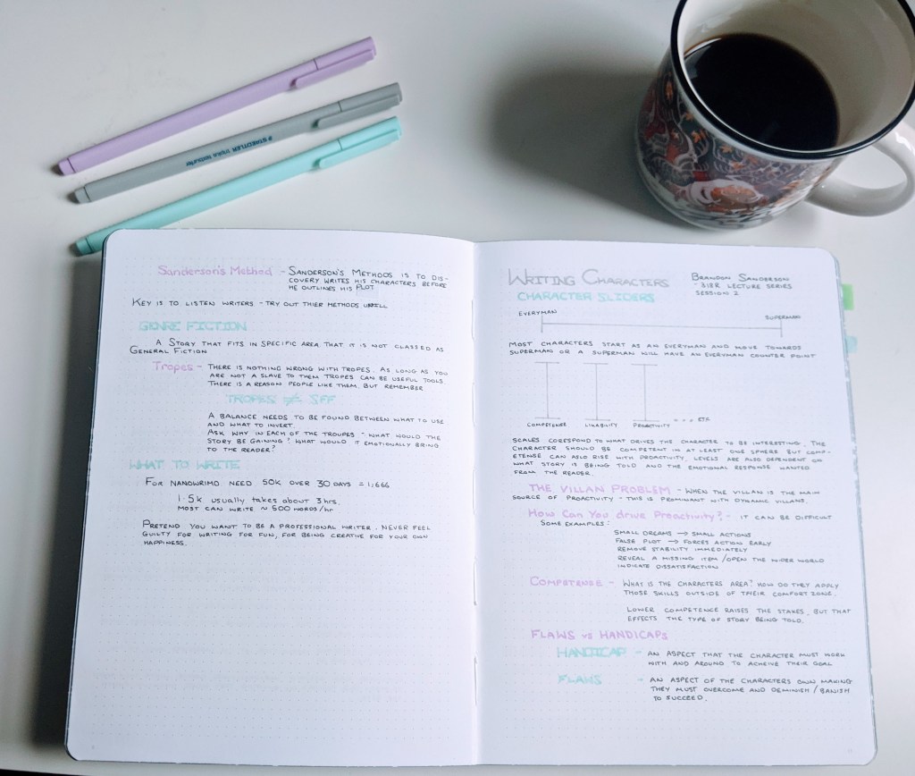 My WIP is currently known as Project Space Opera so I have a project title page with space to write a little synopsis and the true title once I have come up with them. I then have some quick reference sections to fill in while I progress for things I want to remember at a glance such as overarching plotlines, character names and settings. After that I have followed Rachael Stephen’s model of setting up overall todo lists for each of the major sections for writing. from Brainstorming and outlining to the various drafts and edits. This is then followed by the title page for the section I am working on currently which is Brainstorming. I have left several pages blank to work on my concept development and brainstorming, I have covered up spoilers for the information I have filled in. Finally I have dedicated some pages to notes I have made on writing craft books and lectures. These notes in particular are from Brandon Sanderson’s lecture series. You can find various writing resources I use in my Friday 5 post on writing resources.