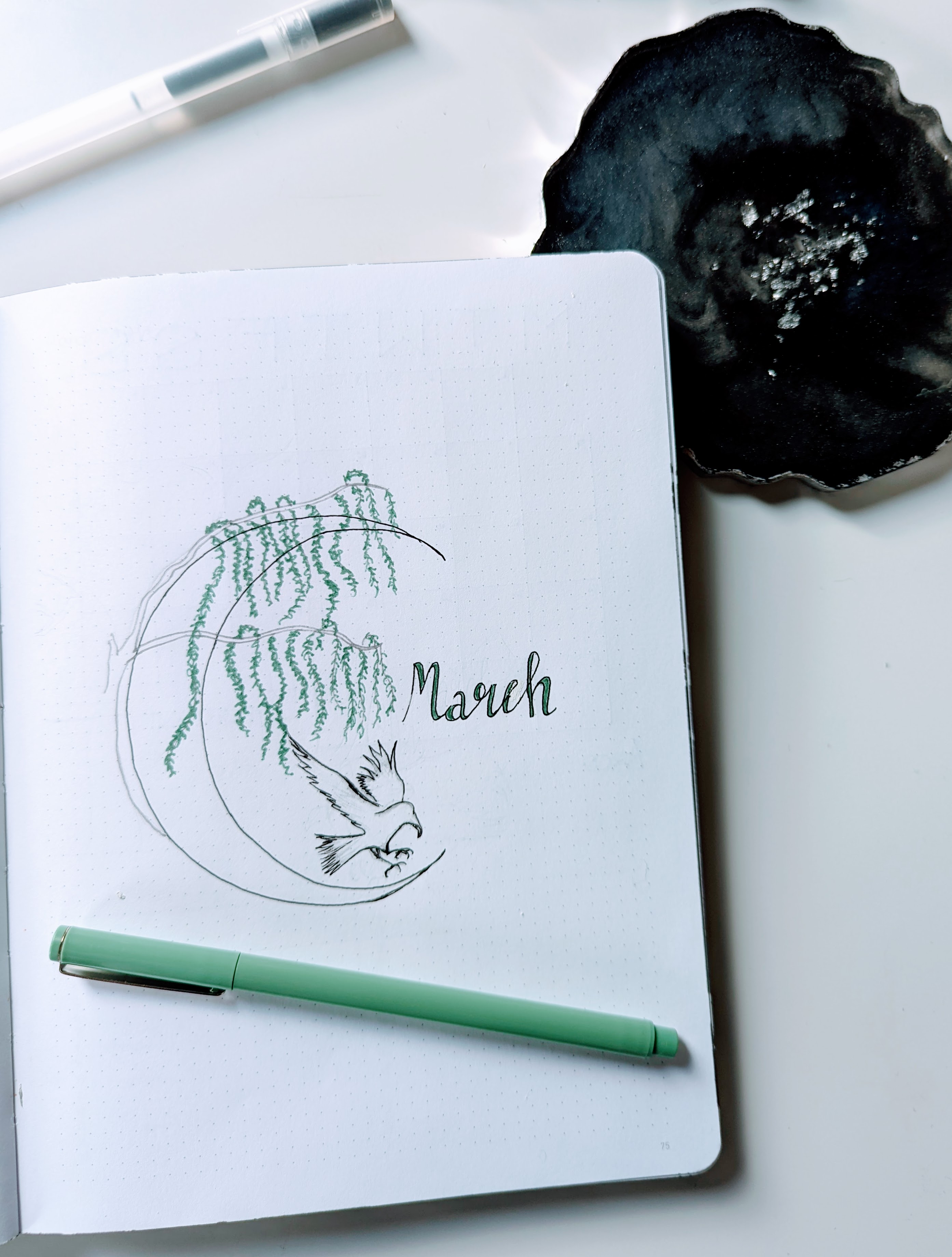 I have jazzed up my Title pages from last year, just to look prettier and to stick to the Moon theme. March’s correspondences include Crow, Willow Tree and the colour Pale Green so I have incorporated them into my design. I tend to bookmark this page just to make it easy to flick back to it and find this month pages.